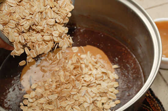 4. tomar la cacerola fuera del fuego, luego añadir Extracto de vainilla, mantequilla de maní y avena. Revolver hasta que todo se mezcla bien.