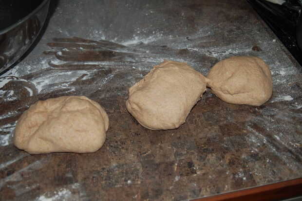 Harina de las manos y apriete de la protuberancia en la mitad. Tomar la mitad y exprima apart en tercios. Forma de los tercios en las formas de pan y colocarlas en las bandejas de pan. Repita con la otra mitad. Cubrir las bandejas de pan y dejar subir otra vez. Determinar si ha resucitado de la misma manera.