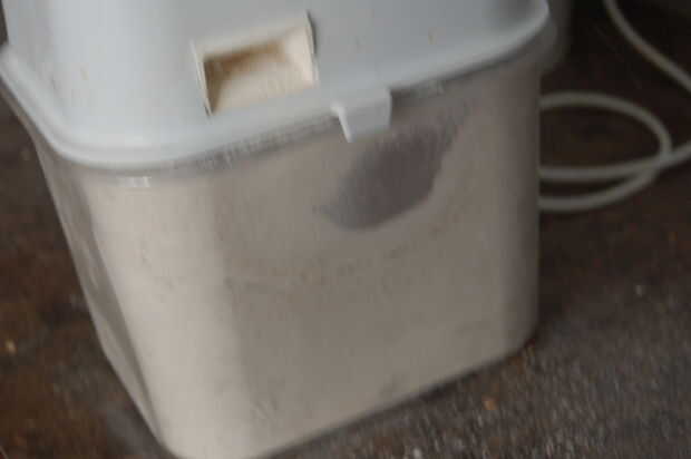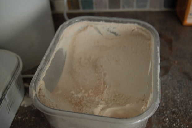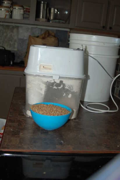 Lo primero que necesitas para el pan es harina. Para hacer pan de trigo entero tendrá que moler el trigo en harina. Si no tienes un molinillo de trigo se puede comprar harina de trigo, pero es muy caro ya que rápidamente va mal. Tienes que moler alrededor de 10 tazas de trigo. Esto probablemente le dará un par tazas de harina extra.