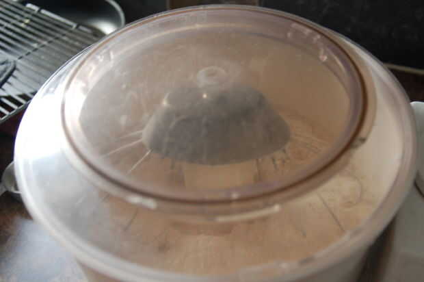 Agregar suficiente harina así que tiene montículos flotantes sobre el agua. Coloque una tapa sobre la taza mientras empiezas a mezclar para no salir contigo. Mezclar en la velocidad más baja. Si es necesario agregar más harina hasta que comience a manojo alrededor de las varillas, como en el video o imagen. Una vez que ha mezclado para un tiempo tomar el bate de y sustituirlos para amasar. Cubra el tazón de nuevo y dejar leudar 15-20 minutos.