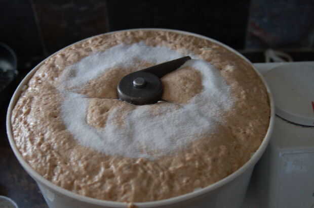 Una vez que se hace creciente Asegúrese de agregar 2 cucharadas de sal. Si olvida el pan probará desagradable. Comenzar mezclando y agregue poco a poco la flor (1/2 taza a la vez). Si usted no está acostumbrado a comer pan de trigo entero después de unas tazas de harina de trigo integral desea cambiar a la harina blanca. Seguir añadiendo harina hasta que comience a limpiar los lados del recipiente como en el video.