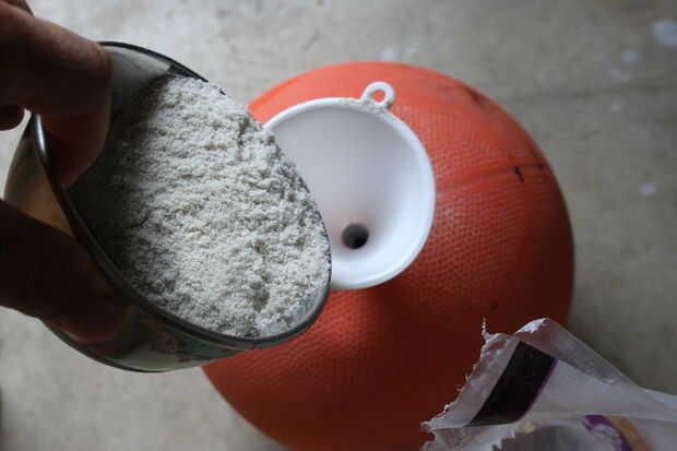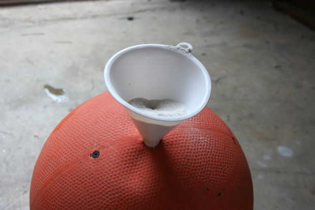 utilicé un pequeño embudo.  Si tuviera una más grande sin duda habría utilizado.  Una vez que se inserta el embudo puede comenzar a añadir el relleno.  Quería una bola de medicina muy pesada trabajar con, así que elegí el juego de arena como mi relleno.  También he hecho los con acolchado de grava y goma de guisante.  Los varios llenadores por supuesto darle combinaciones de diverso peso.  Yo también he combinado rellenos para entre pesos en diferentes artículos que he hecho para mi gimnasio garaje.