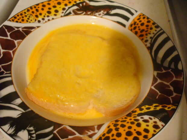 Paso 10: Mojar el otro lado del pan en los huevos revueltos.