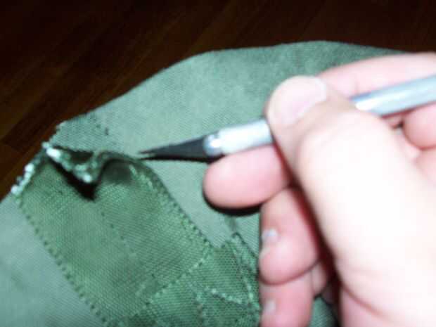 Utilizar la navaja x-acto, corte las correas innecesarias y correas. Tire de la cinta y la tela tan distantes como sea posible para evitar cortar el nylon. Correr suavemente una hoja nueva a lo largo de la costura-en caso que se tensa fuertemente, se 'pop' suelta fácilmente... después de algunos cortes que pueden tire suavemente de la cinta, hasta que quede apretado, momento en el que se corta otra vez hasta que es. Limpiar la rosca exceso cuando haya terminado. El tejido se verá ahora como la segunda imagen se muestra.