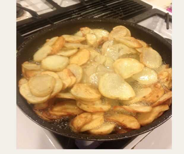 Verter 1-2 tazas de aceite de oliva en el mismo grandes, sartén antiadherente y calor aceite medio a alto calor. Usted puede comprobar para ver si el aceite está suficientemente caliente insertando la punta de una patata en el aceite. Deslice con cuidado las patatas en la sartén, esparciéndolos uniformemente en la bandeja. El aceite debe casi cubrir las papas. Que tendrás que ajustar un poco el calor. Mover las patatas con la espumadera en la sartén hasta que estén cocidos. Si las patatas se rompen en dos cuando se asomó con un tenedor, luego se hacen.