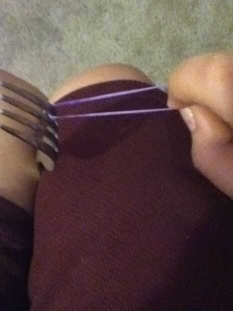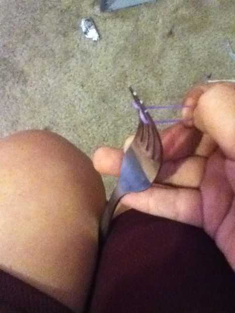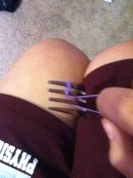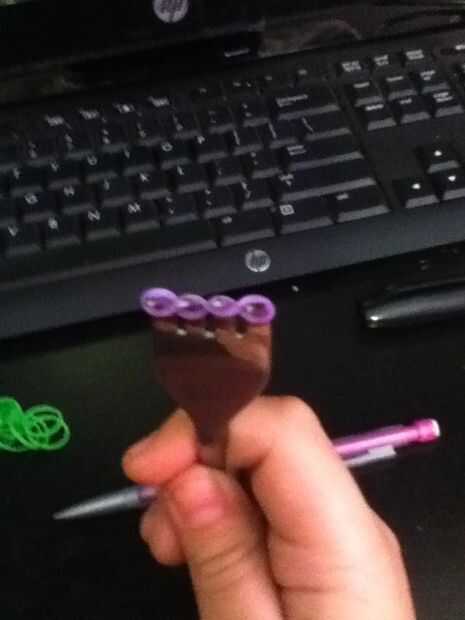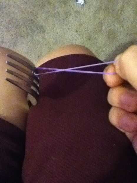 Gancho agarrador de la horquilla y su primera banda de goma (el mío es morado) deslícelo a través de la primera cerda, tire y giro, luego poner sobre segundo cerda, extracción y giro, poner en tercer cerda, tire y gire una última vez y poner en la última cerda Debería ver lo que parece ser dos signos de infinito