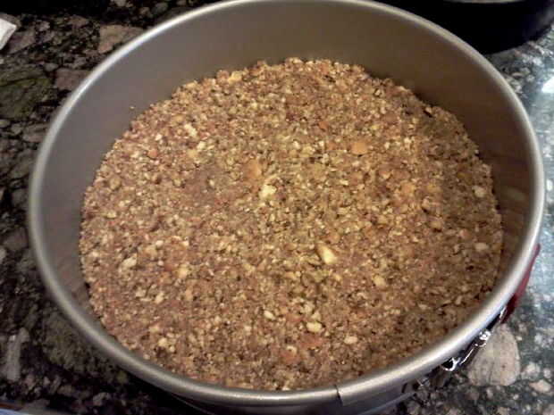 El palillo de la mantequilla en un tazón de fuente del derretimiento. Desmenuzar la taza de Sorbetos de vainilla en trozos finos y mezclar bien con la mantequilla. Ahora se desmoronan las pecanas o su opción de frutos secos en trozos pequeños y añadir a las obleas y mantequilla. Mezclar y luego añadir a la cacerola de aluminio. Cubrir el fondo y los lados de la cacerola.