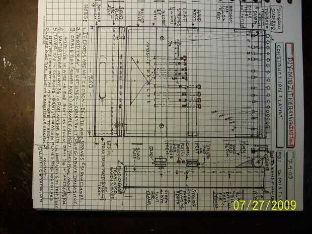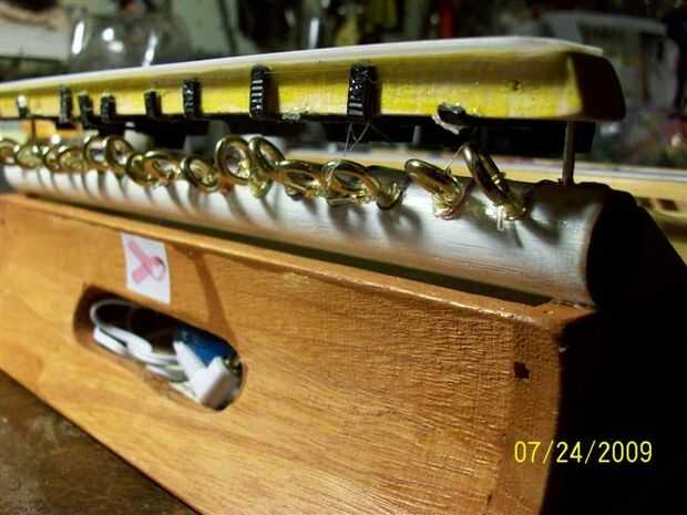 Monte este montaje en alfileres de acero doblado como se muestra y lo insertamos en extremo previamente perforados los agujeros y la varilla de 3/4 a 1/16. Observar las alturas de los pasadores para que las llaves no toquen las cuerdas. Debe ser 1/8 de pulgada sobre las cuerdas. Prueba la tecla doblando hasta la cadena.