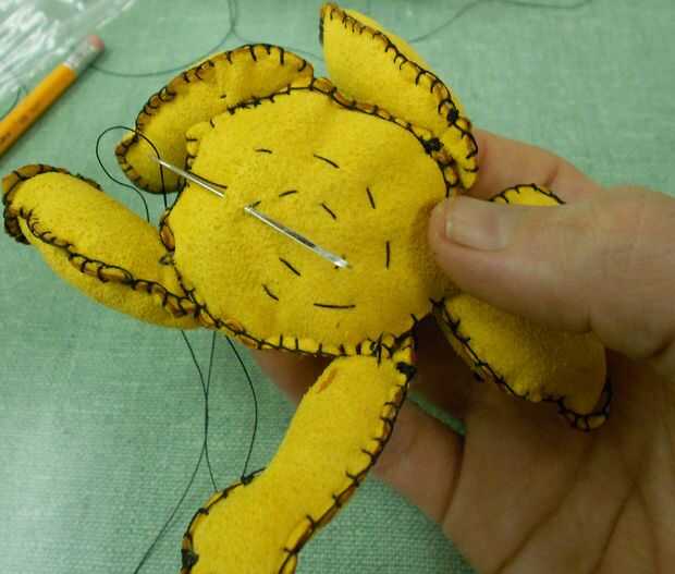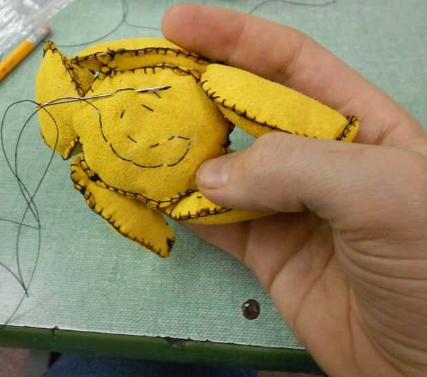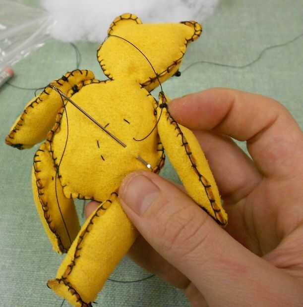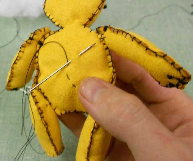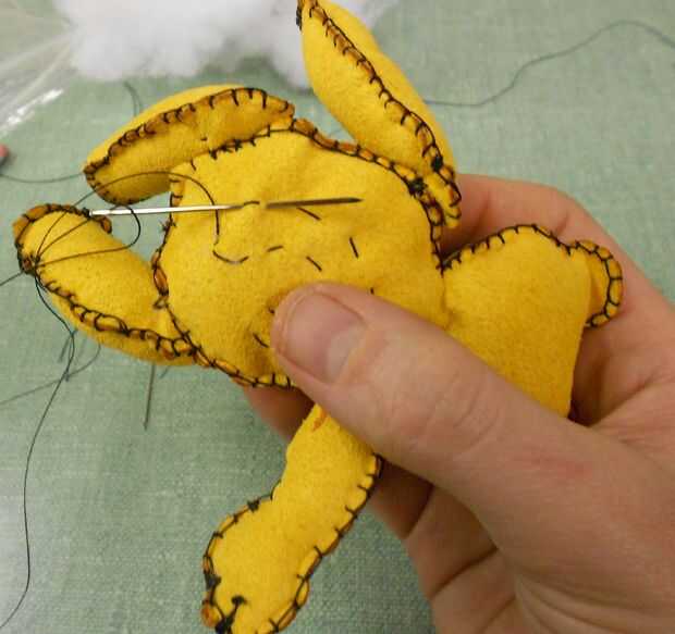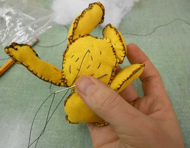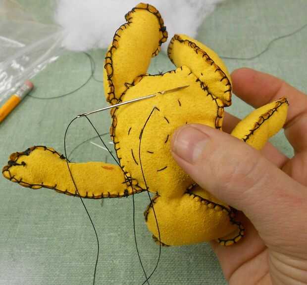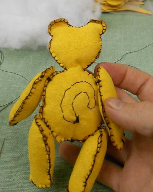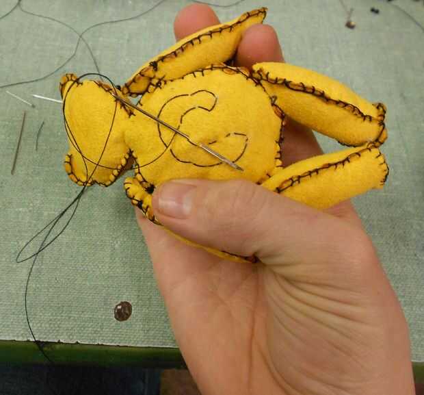 Meter la aguja por la parte posterior, comienza a coser la cola con una puntada simple de funcionamiento. No te preocupes de lo que es perfecto. Cuando regreses a la base de la continua cola, pero esta vez rellene los agujeros en sus puntos de sutura para que la cola se rellena.