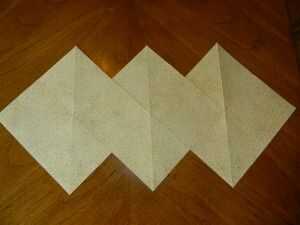 espero que usted puede ver los tres pliegues en este papel. Usted necesitará doblar a tres de sus papeles de cartulina diagonalmente con un pliegue firme y luego abrir. Luego doblar cada pieza por la mitad, pliegues y abrir, luego doblar el pliegue de manera opuesta y abrir. Consejo: para asegurar tus pliegues de libro más fácil, hacer doble doble y doble firmemente con su miniatura o hueso.
