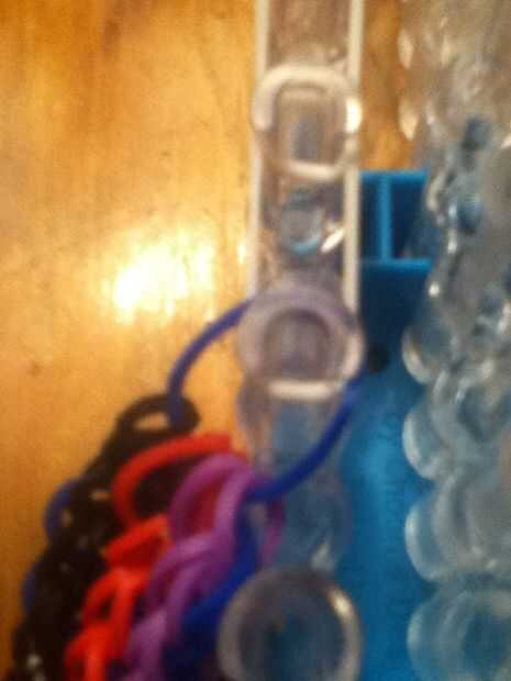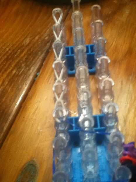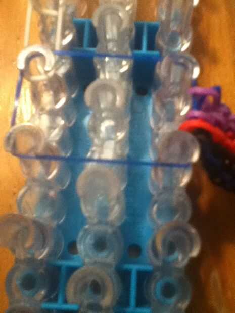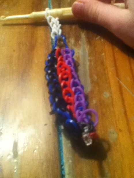 Tomar todas las bandas de goma en el gancho y transferencia en clip. Bandas de caucho más en primera fila como lo hizo en el paso uno pero bajando de clavija superior del lazo. Solo poner tantos como necesita para el tamaño de la muñeca. Añadir la goma de extremo que es colgando desde el primer diseño a la última clavija que pones una banda en. Gancho a final de goma y tirando encima para luego peg, repetir. Al final, poner gancho a través de bandas de goma en peg pasado y sacar. Acople extremo al otro lado de la pinza para cerrar la pulsera.