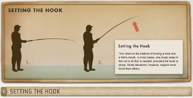 Similar al gancho de agua ajuste pero todo es más grande. Dibujar la línea más con cada contracción y punta de la varilla de duro, con ambas manos. Utiliza ganchos más grandes que no penetran tan fácilmente. Y está tratando de enganchar un pez más grande.