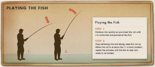 Cuando el pescado se ralentiza y deja de línea más, es tiempo para ir a trabajar. La mejor técnica para la captura es suavemente tire la varilla hacia arriba y luego carrete hacia abajo como se lo baja, con un movimiento de bombeo. Hacer movimientos pequeños, suaves en lugar de grandes barridos abruptos porque ayudará a mantienen la línea apretada y el pescado mucho más tranquilo.