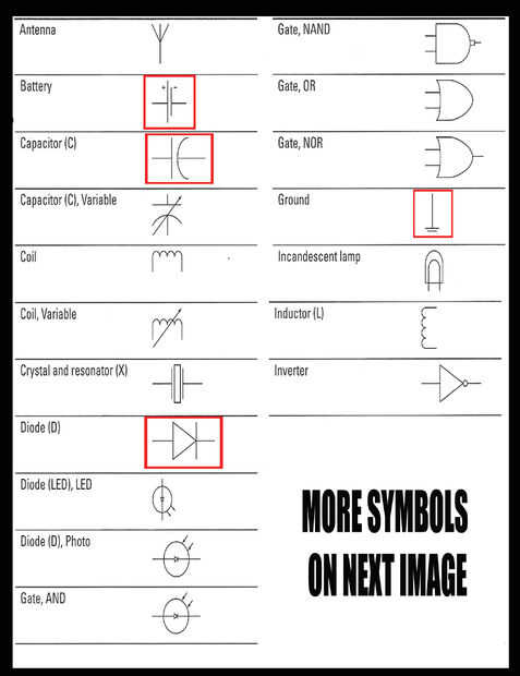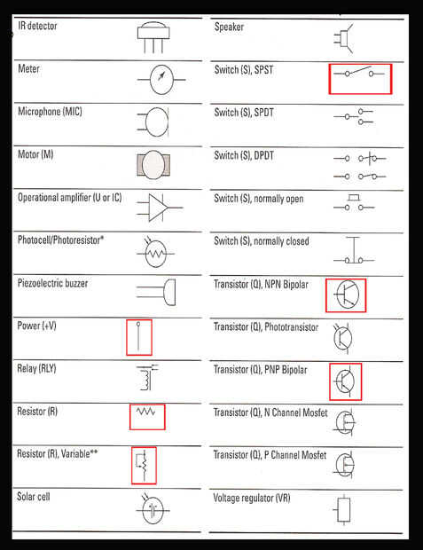 aquí es una pequeña guía que te muestra los símbolos básicos para todo tipo de componentes. es útil para mantener a una pequeña guía de como esta todo en el caso de que olvide algunos. Además, mientras que está empezando puede que tenga que referirse a él con bastante frecuencia. He en caja los símbolos más comunes en rojo, son los que deben llegar a saber de memoria. los demás que siempre puede devolver a la guía.