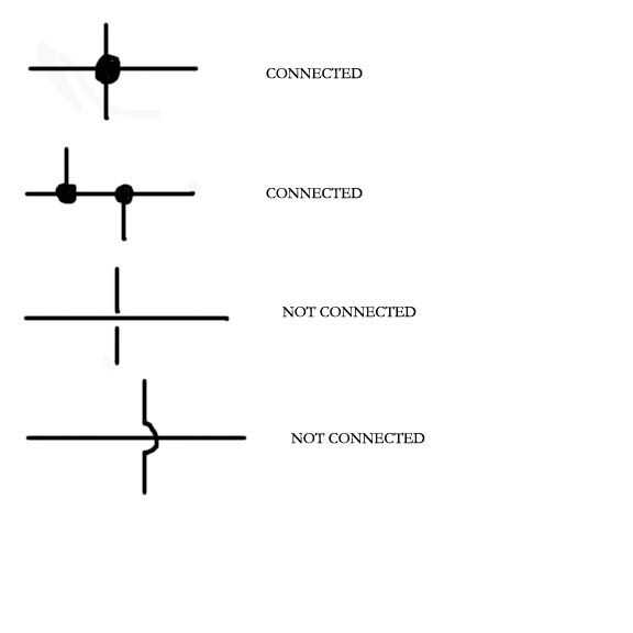 Cuando las líneas negras se cruzan en un diagrama hay maneras de decir si o no los cables deben conectarse entre sí como se muestra a continuación.