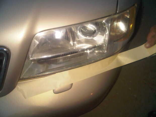 2. proteger las superficies de ajuste y pintadas alrededor de la lente del faro con cinta de enmascarar.