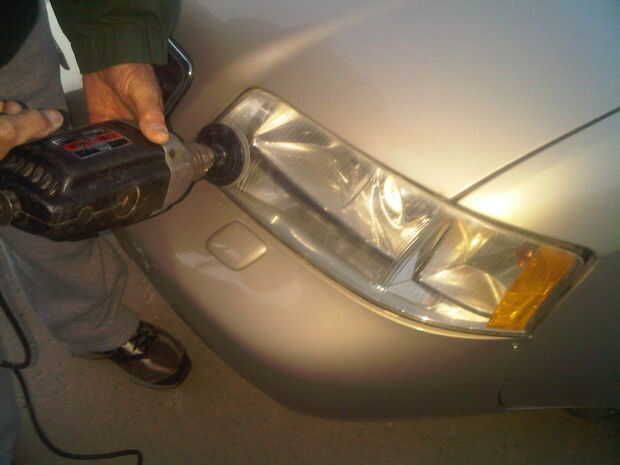 2. Sujete el taladro plana o muy ligeramente inclinada y empezar a lijar la lente con ligera presión hacia abajo sobre el taladro.