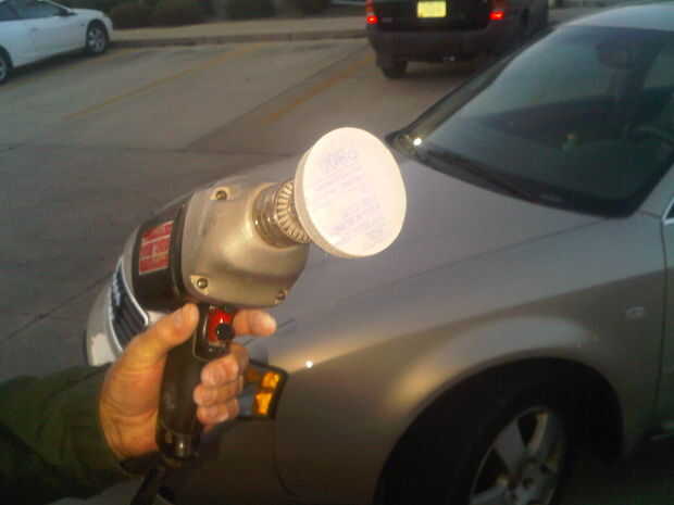 2. con medio a la presión ligera, comenzar a lijar la lente para reducir los arañazos de la arena del paso 2. Asegúrese de realizar varias pasadas por toda la superficie de la lente para asegurarse ese disco # 2 ha eliminado todos los arañazos del paso anterior.