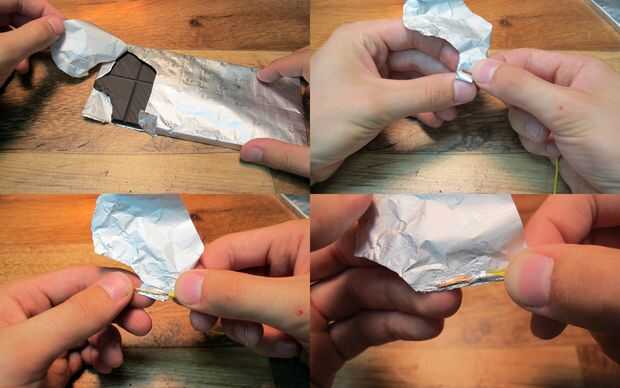2. tome un pedazo del papel de aluminio y envolver el cable de alguna manera. Una pieza necesita papel que es grande por lo menos de 5 x 5cm.