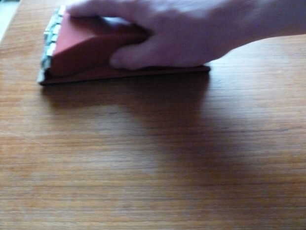 En mis tablas las tapas eran un poco rayado y hay unas marcas de agua de vertidos de la bebida en los años y se ve opaco y desigual en lugares por el sol, decoloración y blanqueo el acabado y secado de la madera. Así que empecé a lijar mis tablas con lija de grano 80 en un bloque de lijado. Hay muy pocas reglas mientras lijado en situaciones como estas excepto siempre usan un bloque de lijado o wi la veta de la madera de la arena en por lo menos una cortada de la madera por lo que es lijar uniformemente y siempre , de lo contrario corre el riesgo de rayar la superficie adicional.