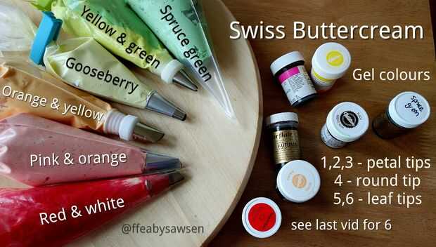 colocar las boquillas de Manga pastelera y viaje la punta exponerlos (o hacer tus consejos DIY). Cuchara en la crema de mantequilla en una bolsa desechable provisto de la boquilla apropiada - consejos de pétalo (o un acoplador vacíelo si solo tiene una boquilla de pétalo) para los colores de la flor, hoja más para los verdes. Pinza para sellar, o simplemente retuerza firmemente.