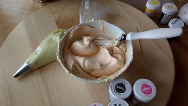 tomar un poco de tu crema y lo puso en uno de los tazones de fuente. mezclar suavemente en una pequeña cantidad de gel de color hasta llegar a la sombra que te gusta. Los colores se muestran en la foto.