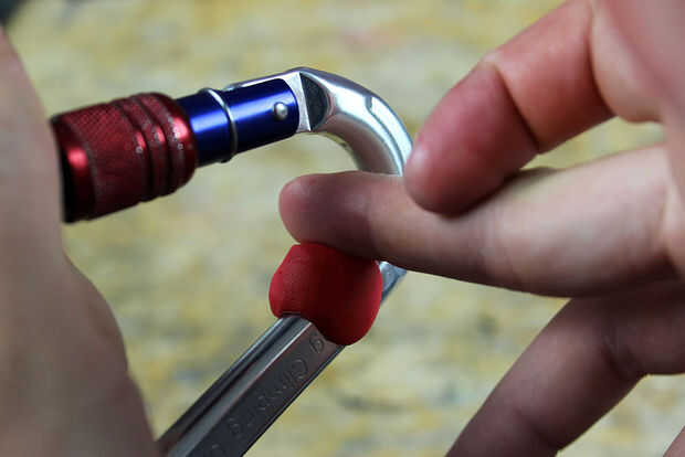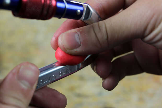 Puede utilizar el borde del dedo como un rodillo para facilitar la sugru hacia abajo sobre el mosquetón. Esto también proporciona el tipo de curva para los ganchos de base.