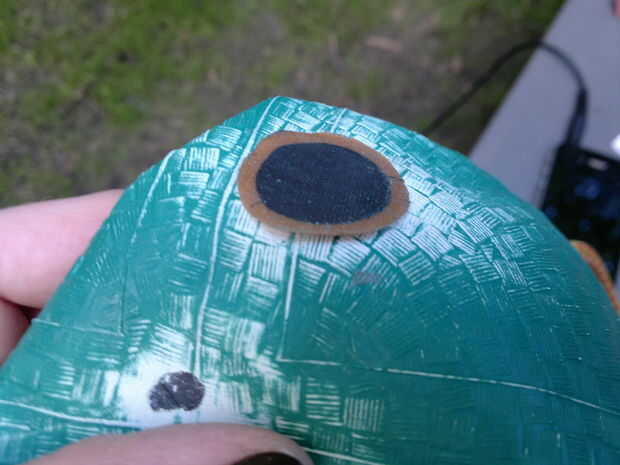 El parche no se adhieren a la piel externa de la bola, y los bordes serán suele venir la peladura apagado, por lo que se debe recortar como parche todo el exceso y luego cubrir el parche con cinta Duc para protegerlo y mantenerlo plano.