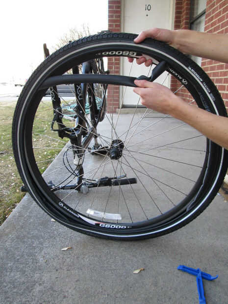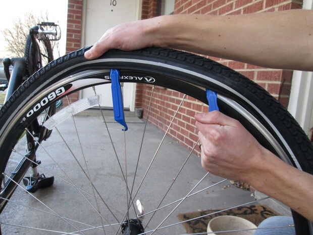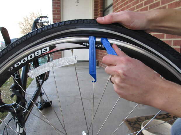 7. Inserte la herramienta de palanca de neumático de bicicleta usando la cuchara, empuje tire hacia un lado con una mano y con el otro uso de la herramienta como una palanca para tirar el neumático en el flanco de la llanta.