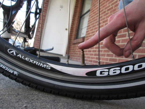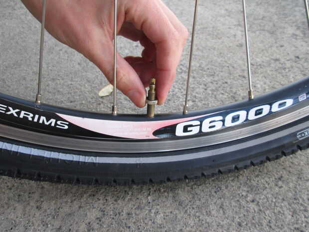 5. Desatornille la tapa de plástico negro de la válvula de aire y aflojar la tapa de metal hasta que puede deprimir deje salir el aire del tubo, presionando la válvula de aire hasta que el neumático puede ser aplanado contra el suelo.