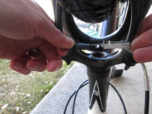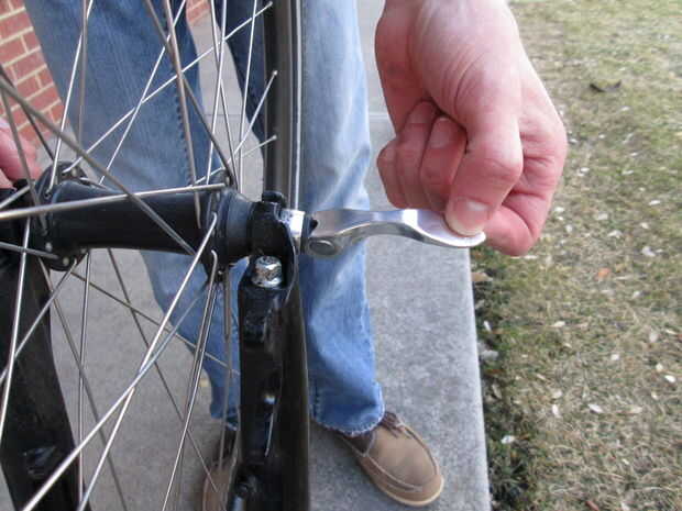 3. desanexa los frenos, ubicar el pestillo del freno por debajo de la llanta, tirando la goma, empujando los dos lados juntos y levantando la pieza de metal