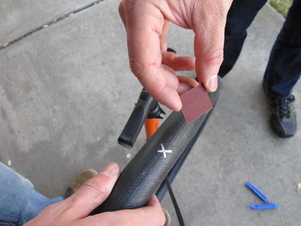 10. aplane el tubo donde se marca la X y luego usando el cuadrado de papel de lija del kit del remiendo, lijar ligeramente un área ligeramente más grande que el parche para crear una superficie áspera donde puede pegar el parche.