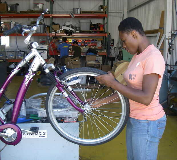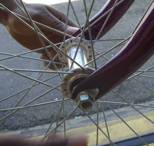 6. colocar la rueda en la bicicleta. Esas arandelas raras gancho en los orificios cerca del extremo de la horquilla.