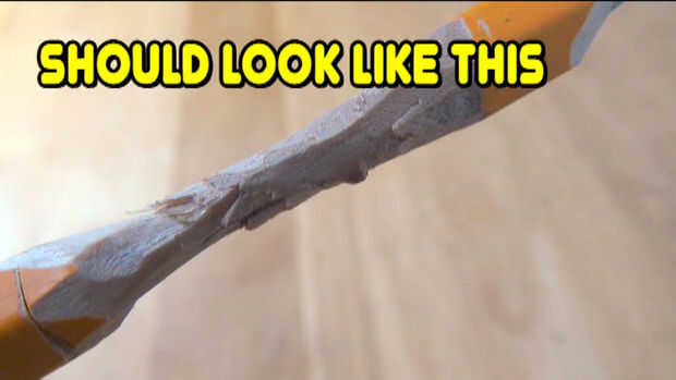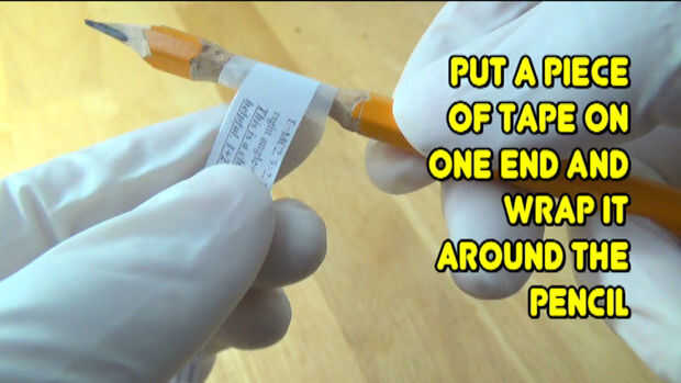 #5-poner un trozo de #5-Put a piece of tape on one end of your cheat note and wrap it around the carve area on the pencil. en un extremo de su truco nota y Envuélvala alrededor de la zona de tallar en el lápiz.