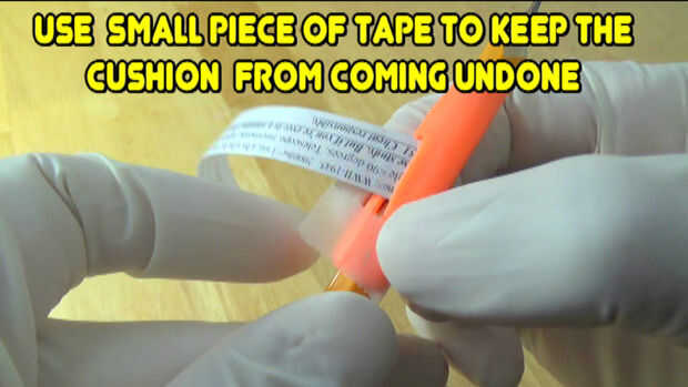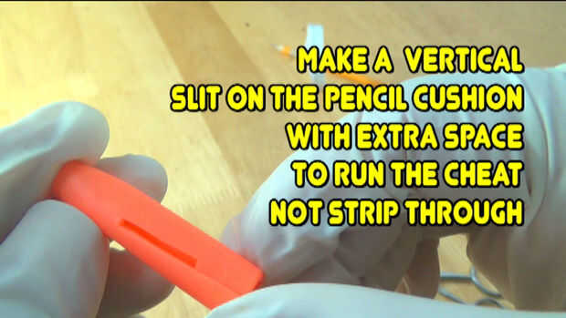 #7-Put the cushion on the pencil, make sure a piece of the cheat note sticks out.