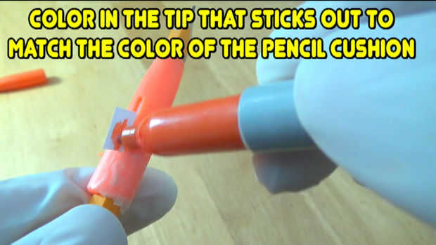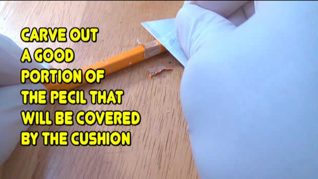#1-First- Take a #2 pencil and carve out or shave off about an inch, it has to be the area where the pencil cushion will go.