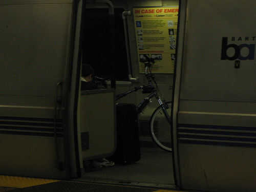 Pueden traer bicicletas a BART durante la mayoría de las veces. Bicicletas plegables sólo se permiten en San Francisco (debajo de Embarcadero) durante hora de acometidas. Cuando te desenvuelves, asiento o soporte a sí mismo en la zona openish cerca de la puerta, por el mapa o la información de direcciones de emergencia. Esté preparado para moverse por una buena cantidad para que no se de manera popular ni ensuciar su ropa. Mismo trato para las personas con mucho equipaje o carritos, etc..