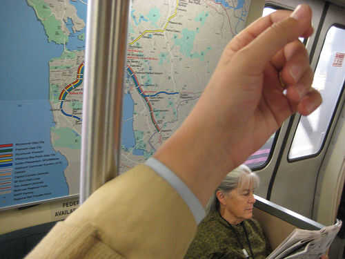 Si es sitio derecho solamente, mover hasta en el coche como sea posible. Mantener un ojo en las paradas más adelante para ver si necesita moverse más si hay un agolpamiento de gente nueva. Lo contrario que fulgor a usted y decirle que "se mueven!" de todos modos. Así que lo mejor es replantear un área con espacio razonable para comenzar con. Hay postes en la parte superior de los coches en la MUNI y BART que puede contener.