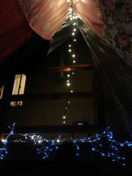Grandes de lugar cubrió la tela encima de la línea de ropa y sujetarla con pinzas. Tienen la tela caída incluso en ambos lados de la línea de ropa en las escaleras. Pesan la tela restante con bloques de cemento para evitar que el viento a través.