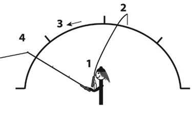 Se enfrentan a la zona de destino con el cuerpo dado vuelta en un ligero ángulo, aproximadamente un cuarto de vuelta. Apunte la punta de la caña hacia el objetivo, sobre el nivel de los ojos.