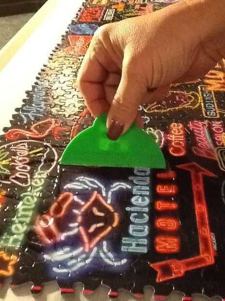 Vierta una cantidad ligera de pegamento puzzle en el extremo corto del rompecabezas que cubre aproximadamente una sección de 6 pulgadas, hacia el extremo opuesto. Usando el separador, distribuir el pegamento puzzle, asegurando que el pegamento cubra el rompecabezas de borde a borde. ADVERTENCIA, asegúrese de que las piezas del borde están bien cubiertas, pero no pegar el rompecabezas para el papel de cera. Repita hasta que cubra completamente el frente del rompecabezas. Deje que el pegamento seco según las instrucciones en la botella de pegamento o dejar secar más tiempo si se aplica una capa gruesa de pegamento.