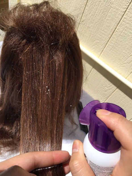 Tomar una sección de 1" directamente en la sección previamente bromas y la parte superior de la sección con laca para el cabello de la niebla.
