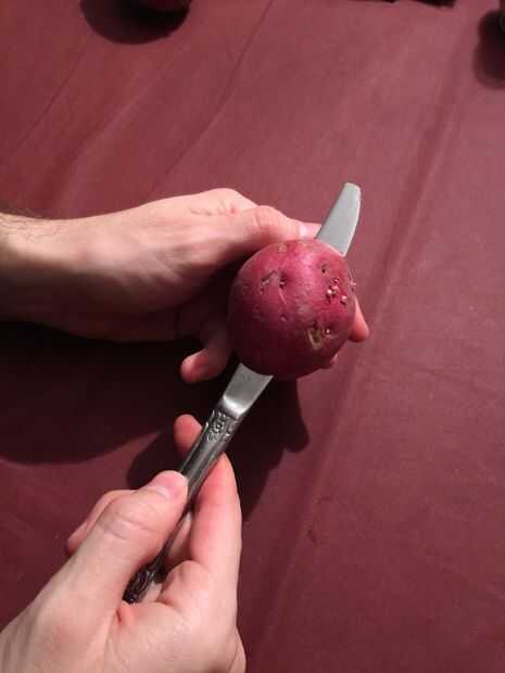 Encontrar un cuchillo embotado o un cuchillo de mantequilla. Tomar la papa y jam el cuchillo por la mitad de la papa a lo largo. Si es perfectamente circular acaba de poner a través del centro en cualquier lugar.