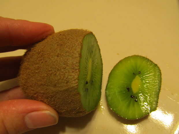 Para empezar, toma su cuchillo y corte suavemente un extremo de la kiwi. Es mejor hacerlo en un plato o tabla de cortar para evitar rayar tu mesa top/contador.