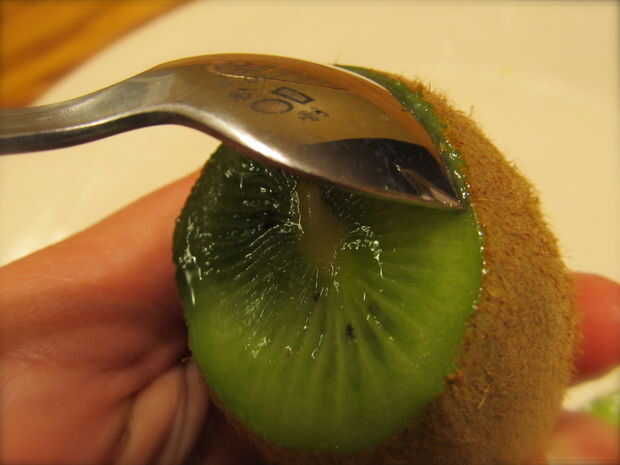 ' Empuje la cuchara debajo de la piel hacia el otro extremo de la kiwi.