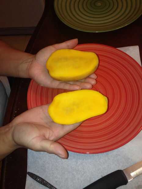 Grab sostenga el mango por la semilla y cuidadosamente corte el mango a la derecha arriba (casi en) la semilla.