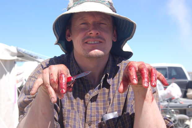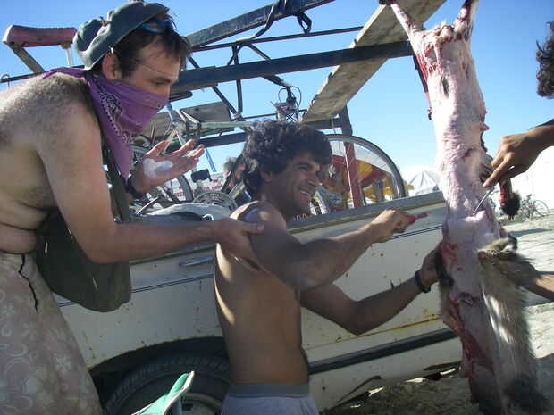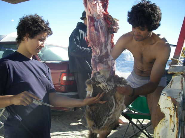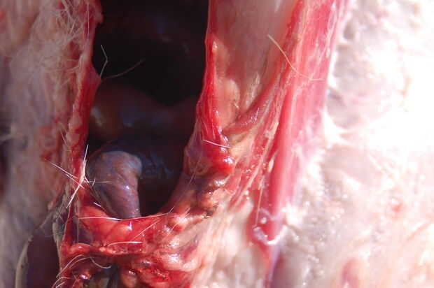 En algún momento, accidentalmente asomó a través de la pared abdominal, y un montón de tripas vino se derrame hacia fuera. Estábamos realmente cuidadosos no a cuchillo los intestinos, que habría arruinado la carne.