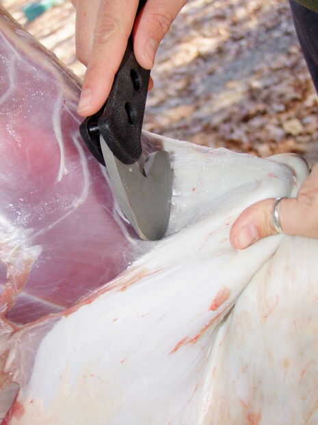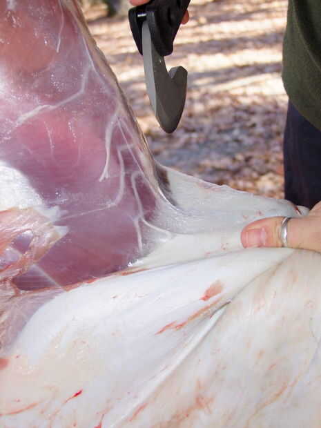 El asimiento de la piel y mantener la tensión en él para que puedan ver la membrana entre la piel y la carne. Su objetivo es simplemente separar la piel de la carne todo el animal entero sin cortar una de las piezas.