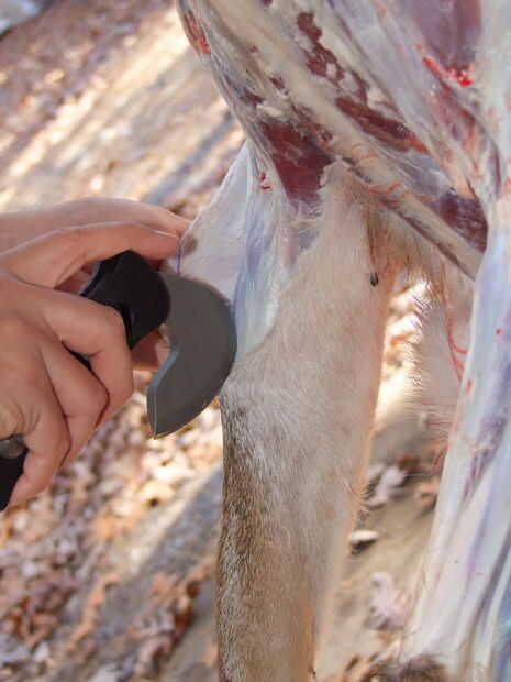 Necesitará repetir este hide de pierna corte al llegar a las patas traseras. Continuar hasta que la piel quede libre de los ciervos.