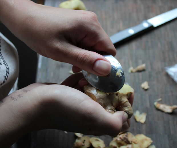Una cuchara es realmente la mejor manera de pelar jengibre! Le permite despegar a la piel, y también se puede obtener en todos los pequeños rincones y grietas, lo que le permite ahorrar más del jengibre.